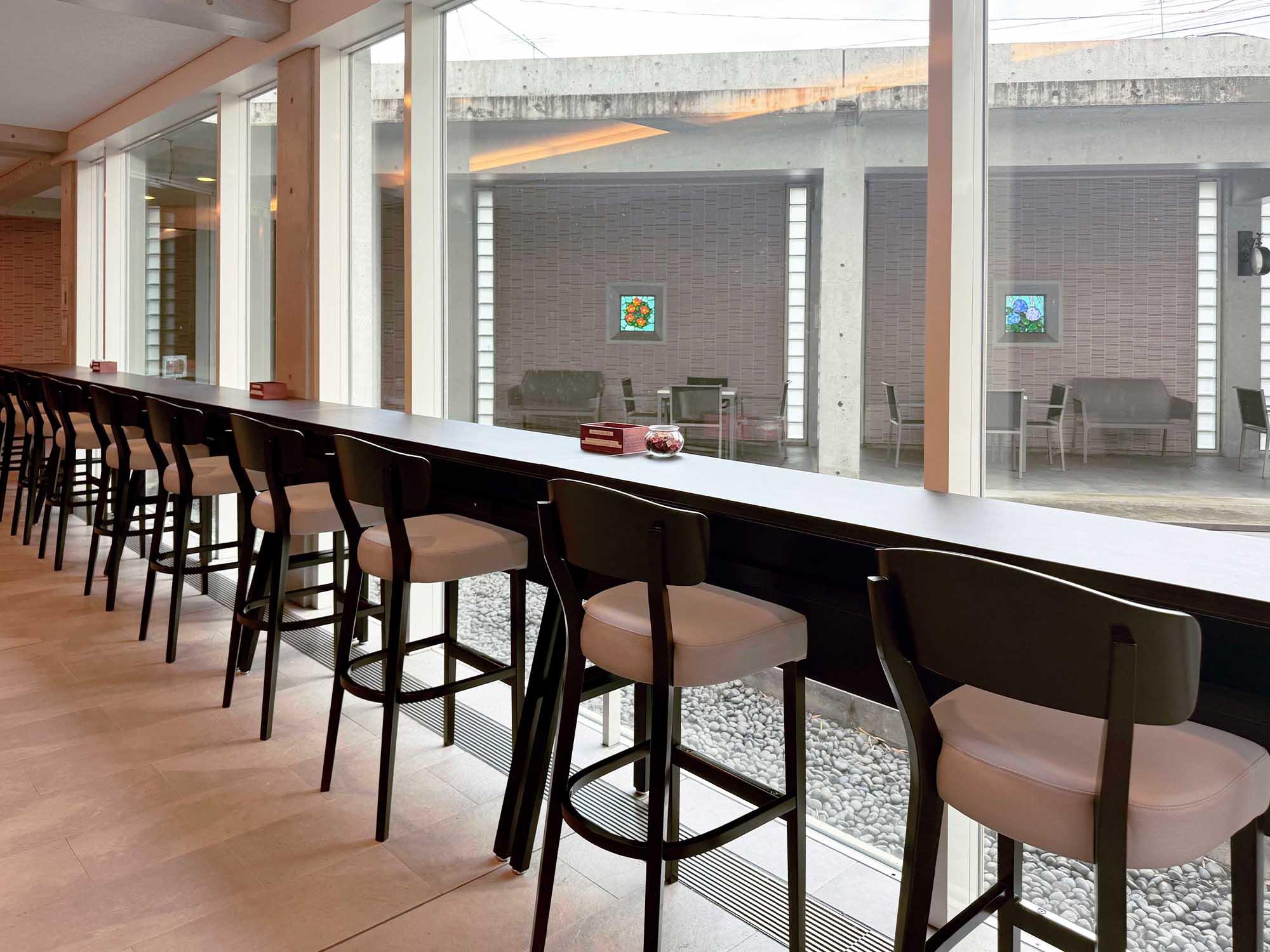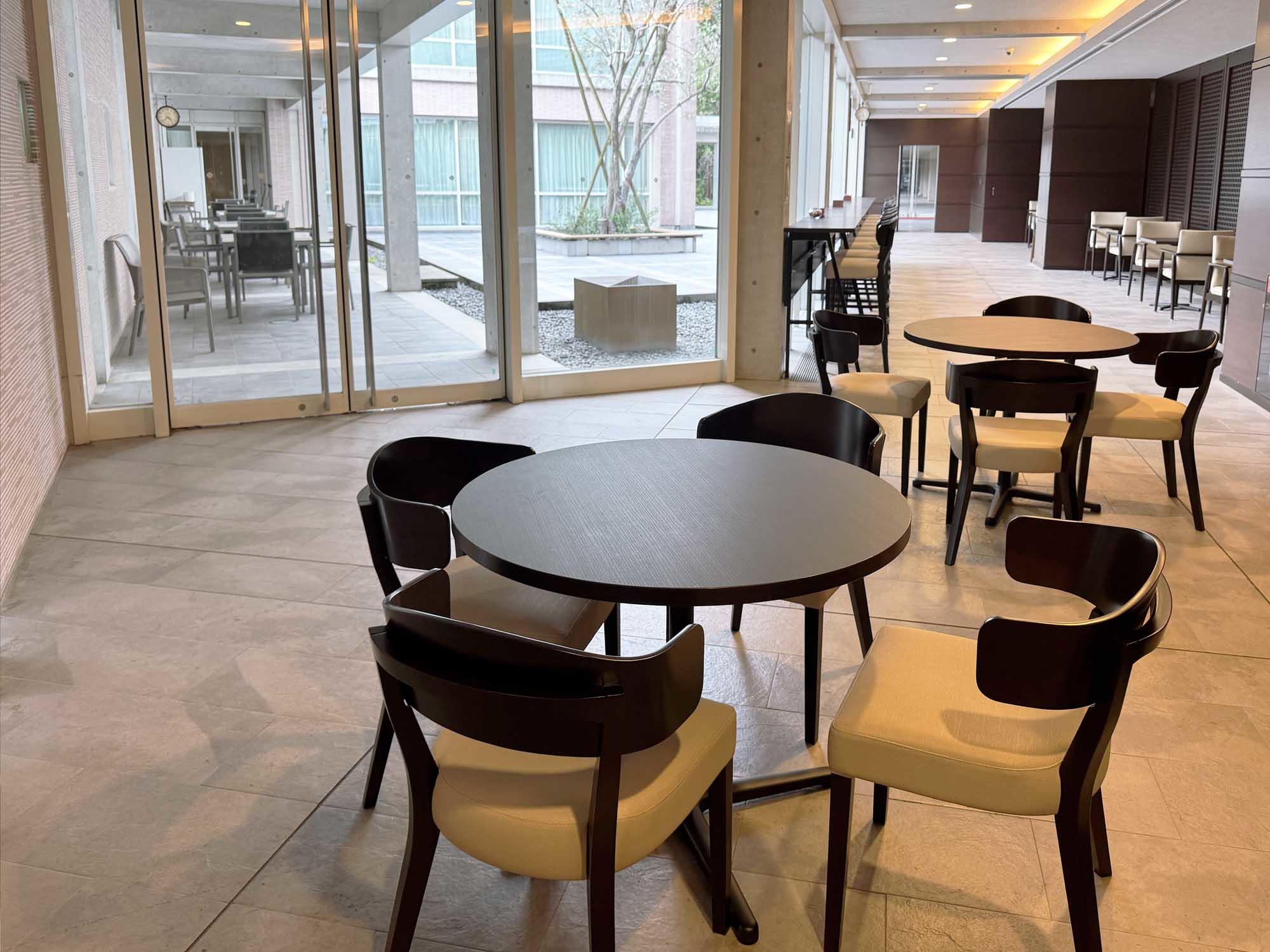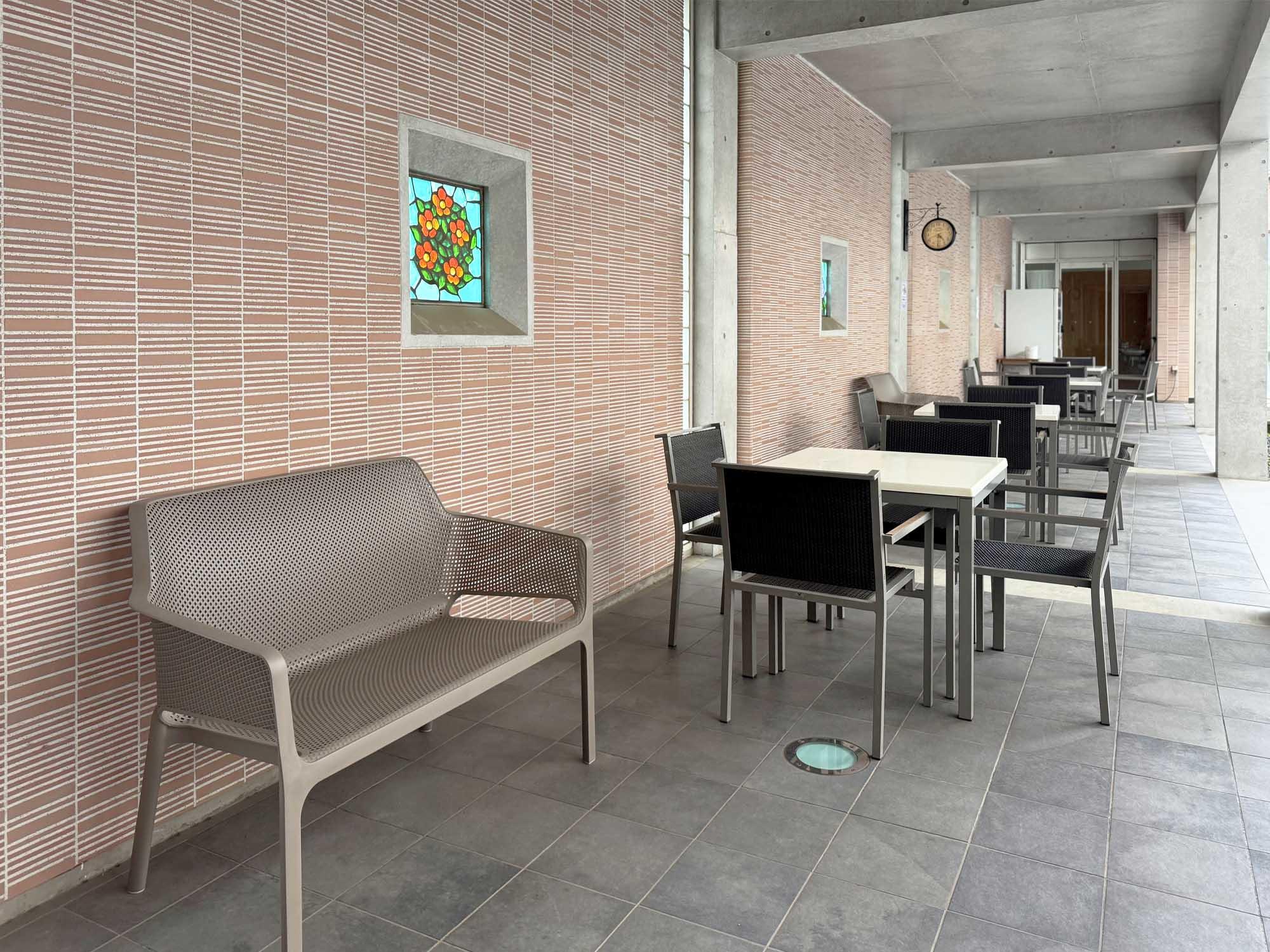 回廊を活用し、快適な憩いのスペースを設けました。壁面は美しいステンドグラスがはめ込まれており彩りを添えています。四人掛けのテーブルセットの横にベンチを配置し、屋外でも快適に利用できる仕様となっており気軽にランチを楽しむことができます。