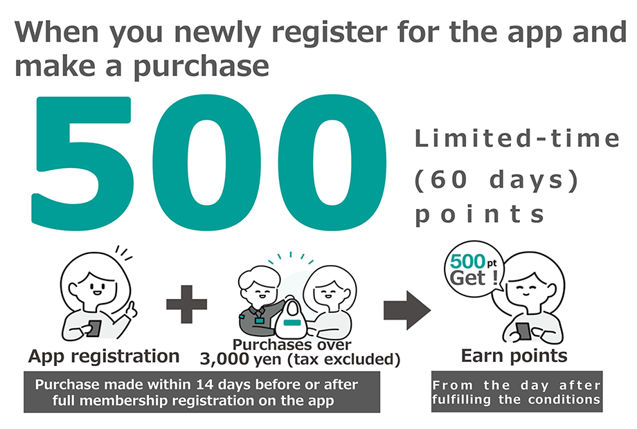 If you newly register for the app and make a purchase of 3,000 yen (excluding tax) or more within 14 days, you will receive 500 app new registration bonus points (limited-time points valid for 60 days). The app registration bonus points will be awarded on the day after you meet the conditions.
